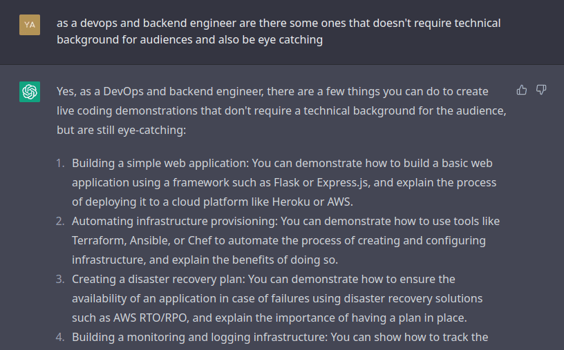 我的策略是找到一些吸引注意力的主題,ChatGPT 給我的建議是遊戲、網頁、AI、視覺化、等等的方向,無奈身為一位後端、雲端工程師,那些不是我擅長的東西,即便我再追問 ChatGPT,他也不能給我滿意的答案,同時滿足「Live Coding、能吸引身邊的人的注意力、後端雲端工程師」似乎是個空集合了。