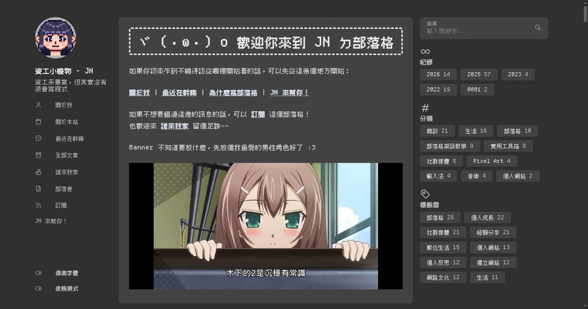 - 資工小廢物 - JN(就是這個部落格):用 Hugo 架的,所有文章都用純文字檔案儲存,有很大的客製化空間!