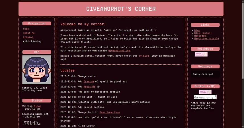 我其實一直都想要在網路上有一個屬於自己的地方可以跟別人互動,但社群軟體又會因為演算法還有不知道什麼時候會突然倒掉增添許多不安因素。感謝給安讓我這個資工小白完成這個夢想(ノ◕ヮ◕)ノ*:・゚✧ ──岳岳