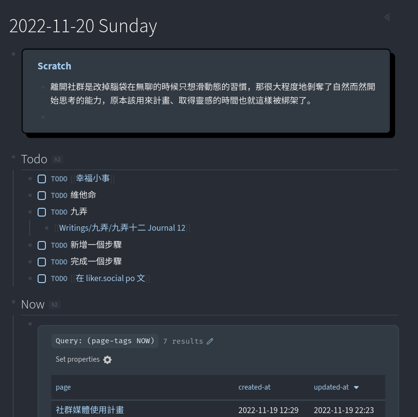 最近開始上班,也開始覺得需要整理上班要處理的事情。我嘗試過了一些筆記軟體,要不是不能自己保管檔案,就是標籤的功能很陽春,再不然就是沒有很好地支援 Markdown。最後還是決定回到 LogSeq 的懷抱,還能享受嵌入頁面還有進階查詢這些好用的功能。